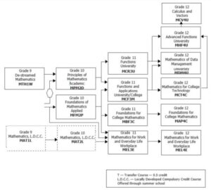 This chart maps out all the courses in the discipline and shows the links between courses and the minimum prerequisites for them. It does not attempt to depict all possible movements from course to course. Note: Advanced Functions (MHF4U) must be taken prior to or concurrently with Calculus and Vectors (MCV4U).