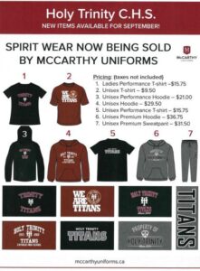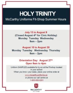 Our uniform supplier, McCarthy’s, is also the supplier for all phys ed clothing at Holy Trinity. At this time, all orders are to be made online. Please see the McCarthy’s website to place your order.